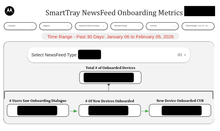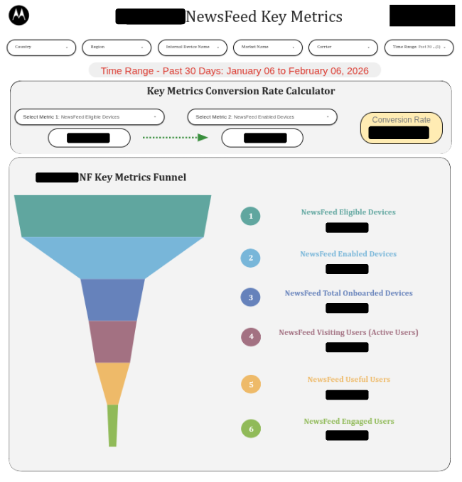 The system supports the Moto NewsFeed software product and its service offerings, including partnerships with Microsoft CoPilot and Taboola. It enables consistent measurement of user retention, engagement, feature adoption and overall product performance directly informing roadmap, experimentation and P&L related decisions.